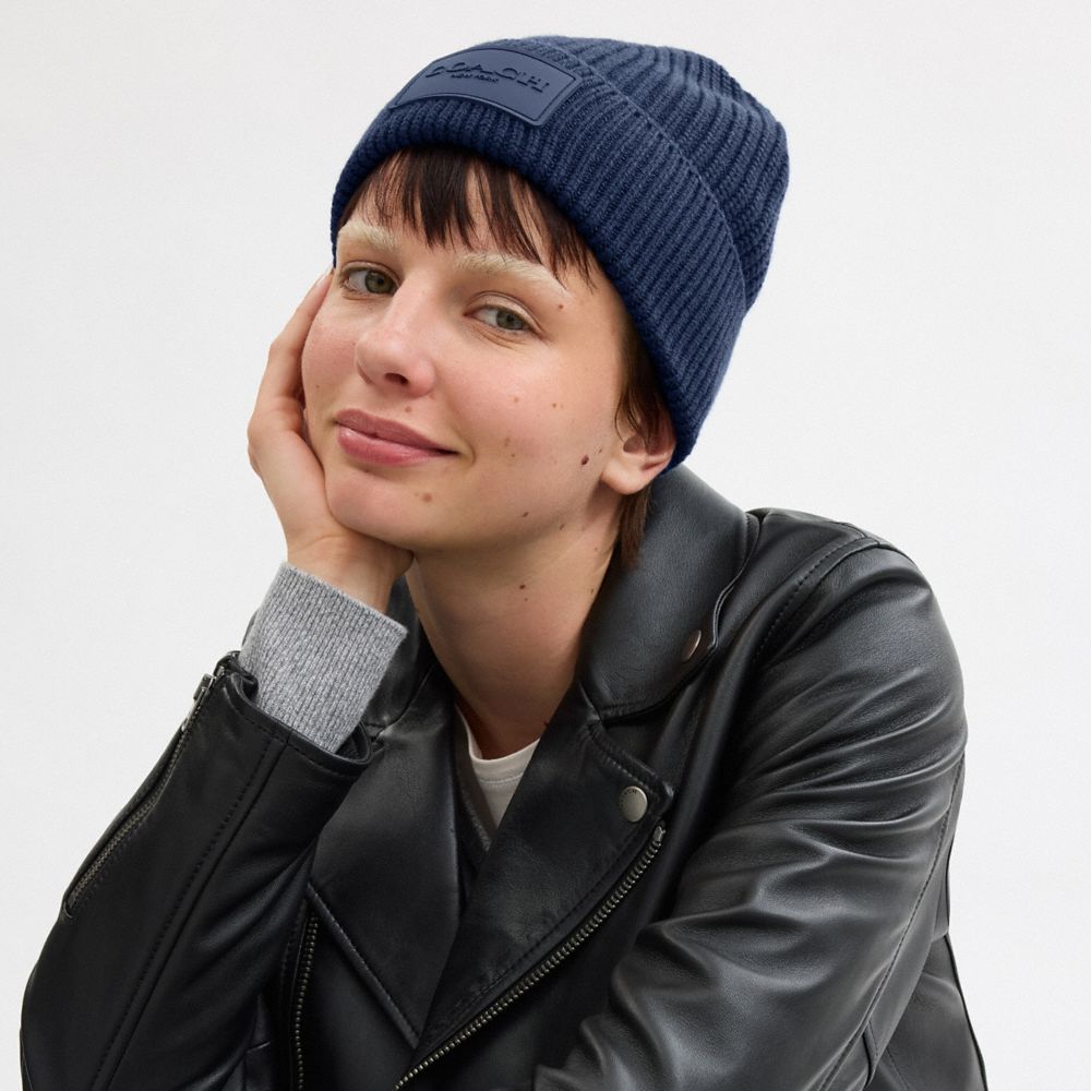 COACH®,Knit Beanie With Rubber Patch,Wool,Beanie,Ribbed,Logo,Applique,Casual,Navy,Detail View
