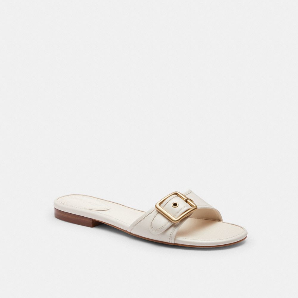COACH®,Margot Flat Sandal,Leather,Synthetic,Slides,Plastic,Fabric,Pull Tab,Casual,Cream,Front View