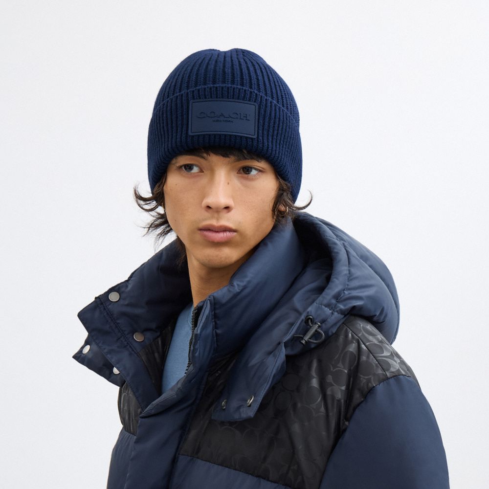 COACH®,Knit Beanie With Rubber Patch,Wool,Beanie,Ribbed,Logo,Applique,Casual,Navy,Angle View